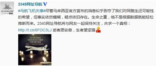 此外,網(wǎng)站右側(cè)醒目的馬航MH370專題依舊在保持最新消息的實(shí)時(shí)更新。2345網(wǎng)址導(dǎo)航官方微博今日將頭像換為灰色,并發(fā)布微博表示:“盡管馬來西亞官方宣布的消息似乎剝奪了我們對(duì)同胞生還可能性的希望,但事實(shí)依然模糊,疑點(diǎn)依舊存在。生命之重,絕不是根據(jù)數(shù)據(jù)就能輕松推斷而來。2345網(wǎng)址導(dǎo)航將與網(wǎng)友一起保持關(guān)注,共求一個(gè)真相。”