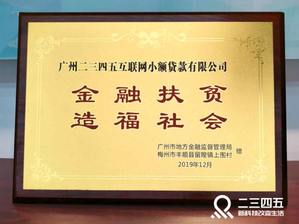 12月18日廣州市金融局召開廣州市金融行業(yè)扶貧工作會(huì)議,對(duì)2019年助力扶貧的企業(yè)進(jìn)行授牌,并授予二三四五旗下子公司廣州二三四五互聯(lián)網(wǎng)小額貸款有限公司(以下簡(jiǎn)稱“廣州二三四五小貸公司”)“金融扶貧 造福社會(huì)”榮譽(yù)。